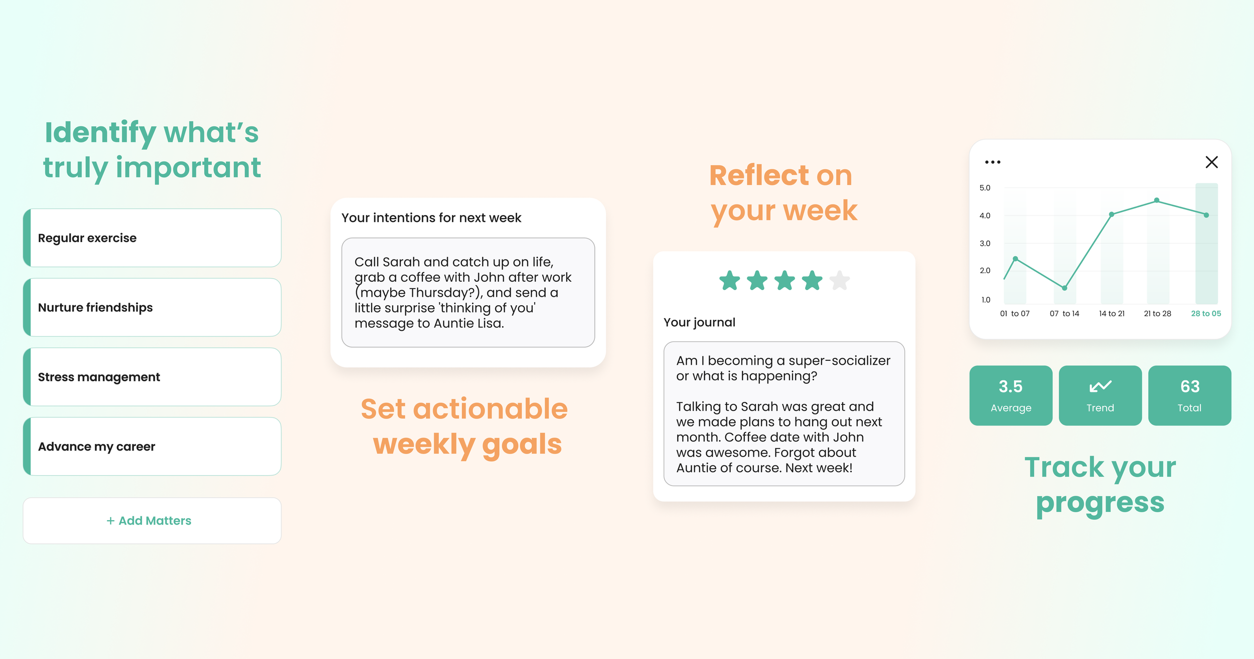 From increased self-awareness to tangible progress, Matters empowers you to prioritize what truly matters and take intentional steps towards your aspirations.