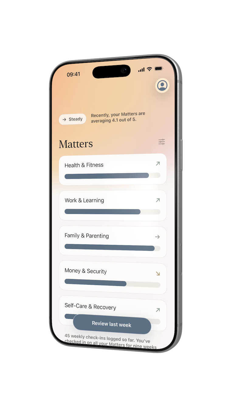Matters is built around a simple weekly check-in. It helps you stay close to what matters without turning reflection into a daily task.